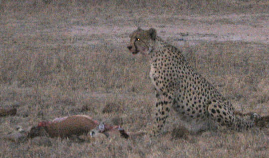 The safari started at about 4:30, and according to Des, we had a pretty remarkable first day. Rhinoceroses, buffalo, and elephants or three of the big five (no lions or leopards that evening). Then, before heading in Leonard asked if there were anything else we wanted to look for. Des answered he'd like to see a Cheetah. We drove out of the bush, rounded a corner and came across a cheetah in the middle of the road eating an impala -- unbelievable.