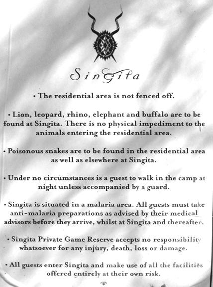 After a check-in process where we signed away our lives if we were attacked by animals, and were told that we couldn't go out at night without a guard -- we were taken to our private, secluded and spectacular lodge. (Video tour all three of our lodges).