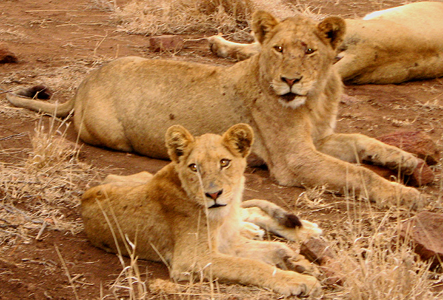 The best part of our Lebombo safaris by far was the large pride of lions we ran into several times. I got lots of great pictures, and several times we saw them on a hunt -- but we never did see a kill. We did find a bunch of them eating a baby giraffe one night and there is some graphic footage of that here. |